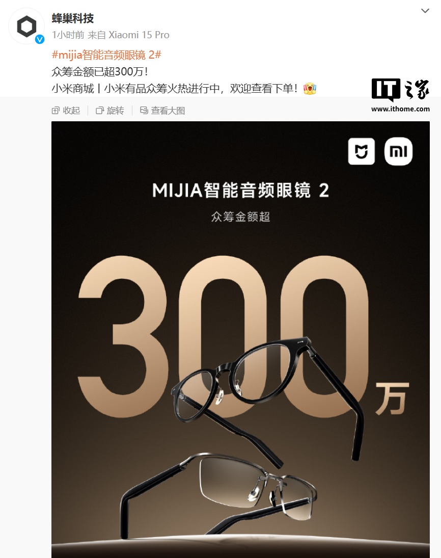IT之家 3 月 26 日消息,北京蜂巢世纪科技有限公司官方微博今日发文称,MIJIA 智能音频眼镜 2 众筹金额已超 300 万。