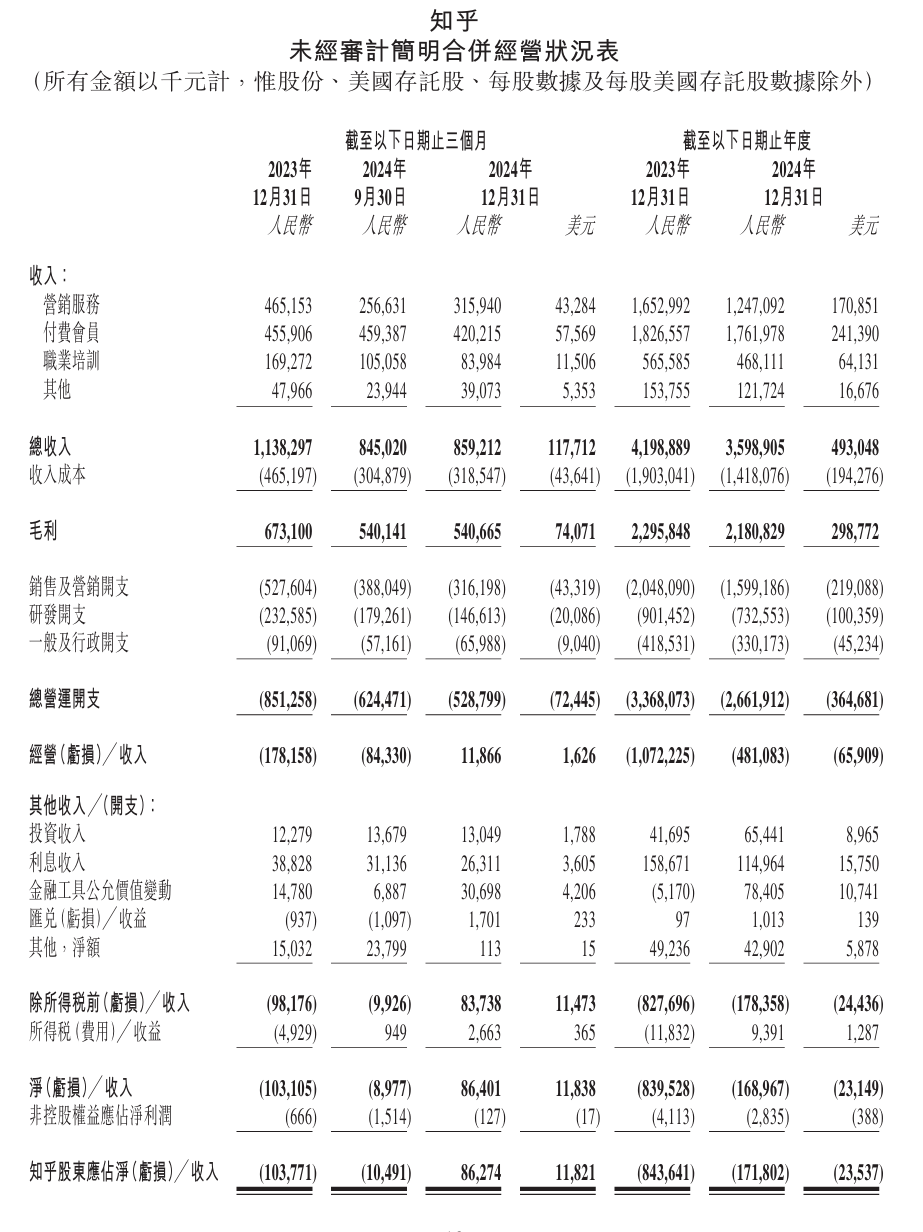 IT之家 3 月 26 日消息,知乎今日发布截至 2024 年 12 月 31 日止季度及全年未经审计财务业绩公告: