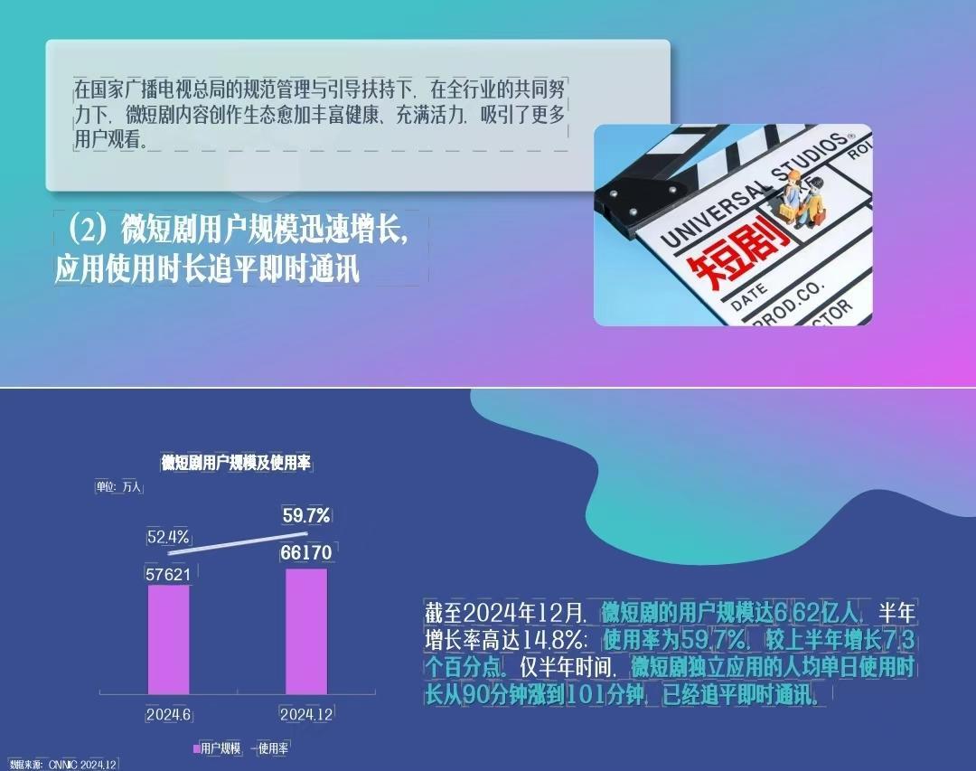 《报告》显示,微短剧的用户规模截至 2024 年 12 月达 6.62 亿人,半年增长率高达 14.8%;使用率为 59.7%,较 2024 年上半年增长 7.3%。仅半年时间,微短剧独立应用的人均单日使用时长从 90 分钟涨到 101 分钟,已经追平即时通讯。