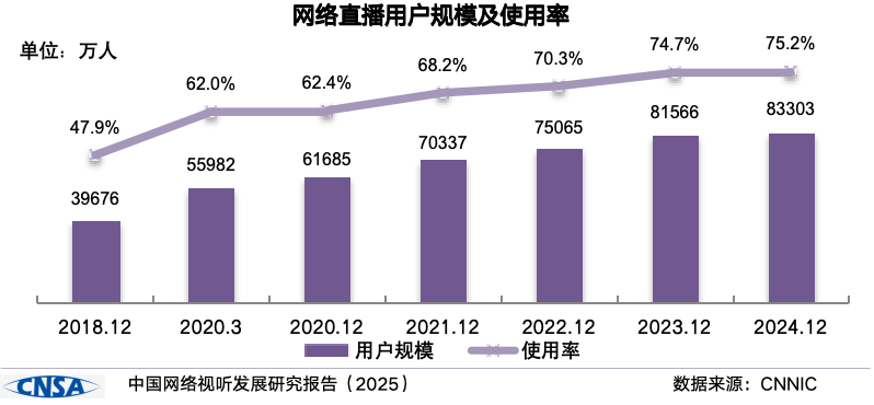 截至 2024 年 12 月,我国网络直播用户规模为 8.33 亿,同比增长 1737 万,占网民总数的 75.2%,同比增长 0.5 个百分点。