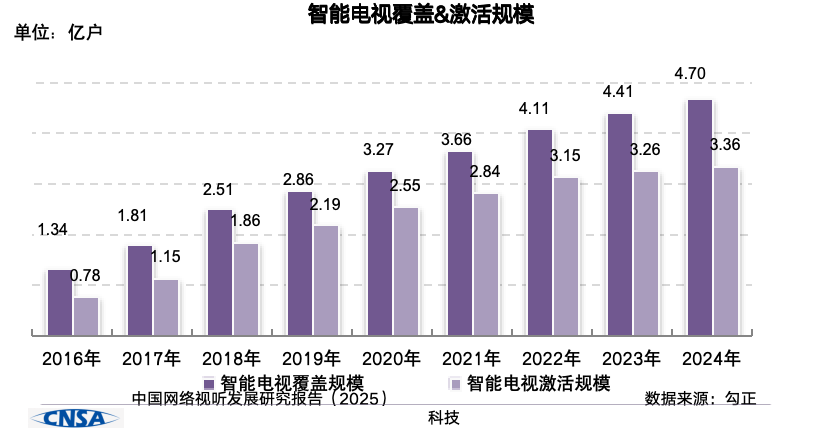 截至 2024 年底,全国有线电视实际用户达 2.09 亿户,IPTV 用户总数达 4.08 亿户,智能电视(OTT,不包括 OTT Box)激活终端 3.36 亿户,智能电视月活率保持在 88% 以上,单日户均开机时长达 331 分钟。