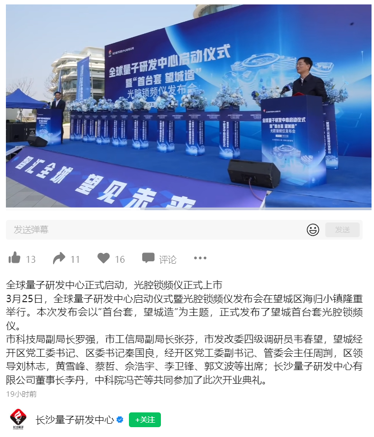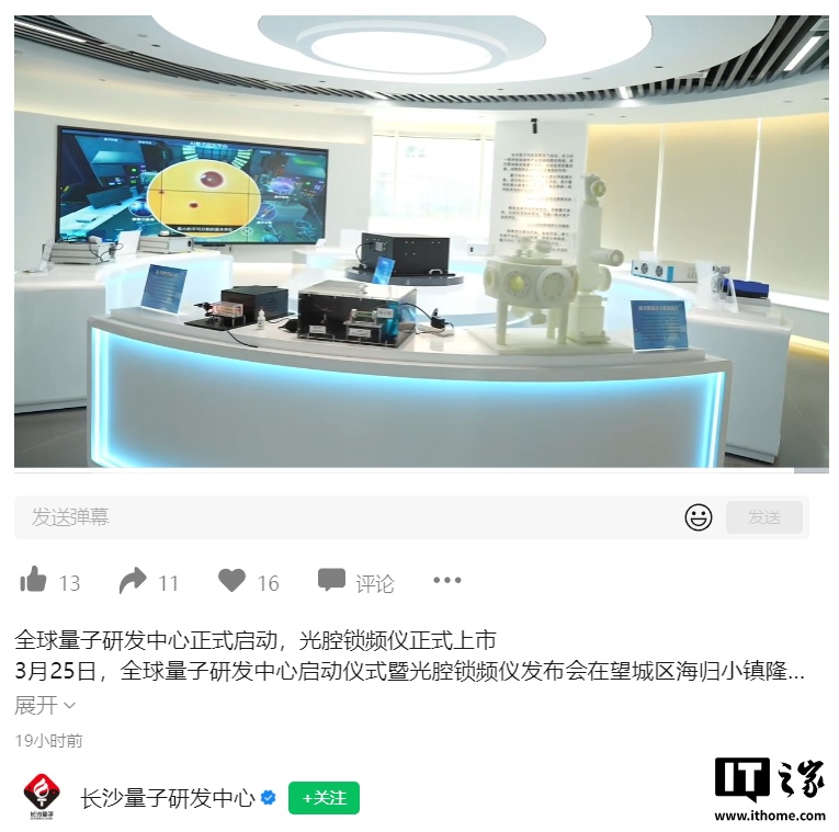 IT之家 3 月 26 日消息,据湖南日报报道,长沙全球量子研发中心项目 3 月 25 日在长沙市望城区大泽湖海归小镇研发中心正式启动运营,并发布国产首台套光腔锁频仪。