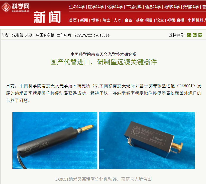 IT之家 3 月 26 日消息,据中国科学报消息,日前,中国科学院南京天文光学技术研究所(以下简称南京天光所)基于郭守敬望远镜(LAMOST)成功研发出纳米级高精度微位移促动器,解决了长期依赖国外进口的“卡脖子”问题。
