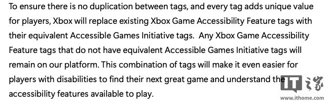 ▲ 现推出的“无障碍标签”在 2021 年 11 月,微软 Xbox 推出了“游戏无障碍功能标签(Game Accessibility Feature Tags)”,为 Xbox 上的玩家提供了无障碍方面的便利,如今微软 Xbox 联合各家公司加入“无障碍游戏倡议”,可将各个公司间游戏的无障碍功能标签表述标准化,消除各大公司之间的标准隔阂;玩家可借助标准化的“无障碍标签”,购买前无需再猜测标签含义,所有无障碍功能细节一目了然。