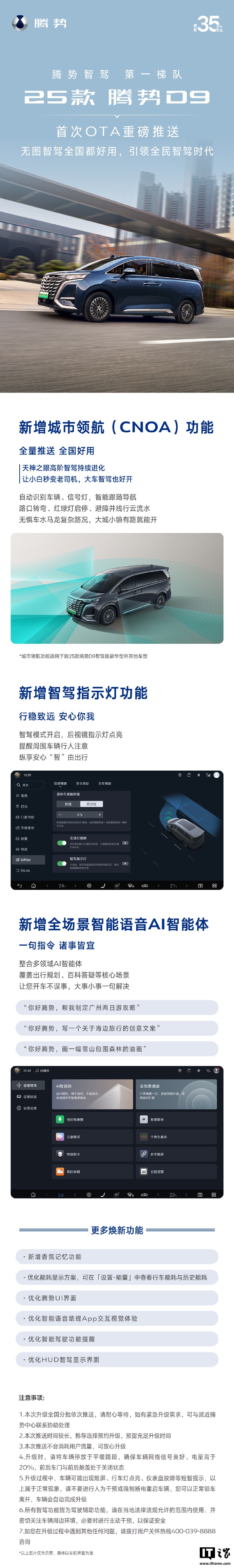 IT之家注意到,此次升级将全国分批次推送。升级过程中,车辆可能会出现烟、行车灯点亮、仪表盘故障等短暂提示,属于正常现象,用户无需干预,车辆会自动完成升级。