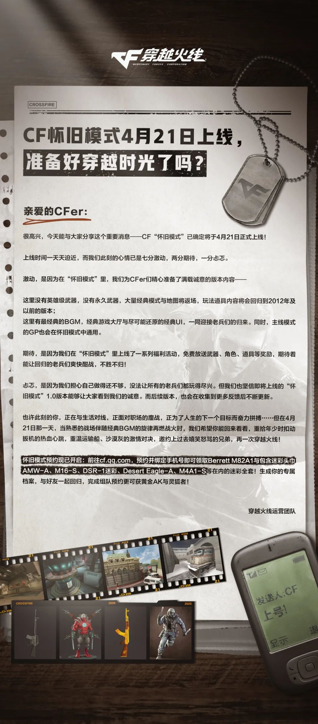IT之家 3 月 26 日消息,腾讯代理 FPS 游戏《穿越火线》国服官宣,《穿越火线》怀旧模式定档 4 月 21 日。