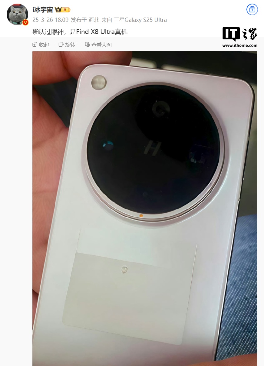 IT之家注意到,博主 @i冰宇宙 昨日分享了一张新机图片,并称“确认过眼神,是 Find X8 Ultra 真机”。图片显示,新机将延续哈苏联名影像设计,后置居中深色相机模组,闪光灯位于手机后盖左上角。