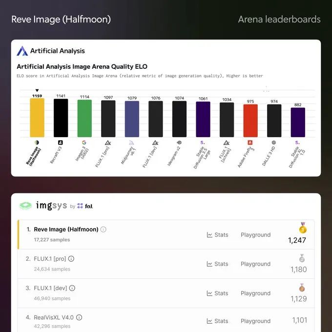 在第三方平台 Artificial Analysis 的“图像生成质量”排行榜中,Reve Image 击败 Google Imagen 3 等对手位列第一,评测特别认可其生成的图像内文字清晰度。IT之家附上相关截图如下: