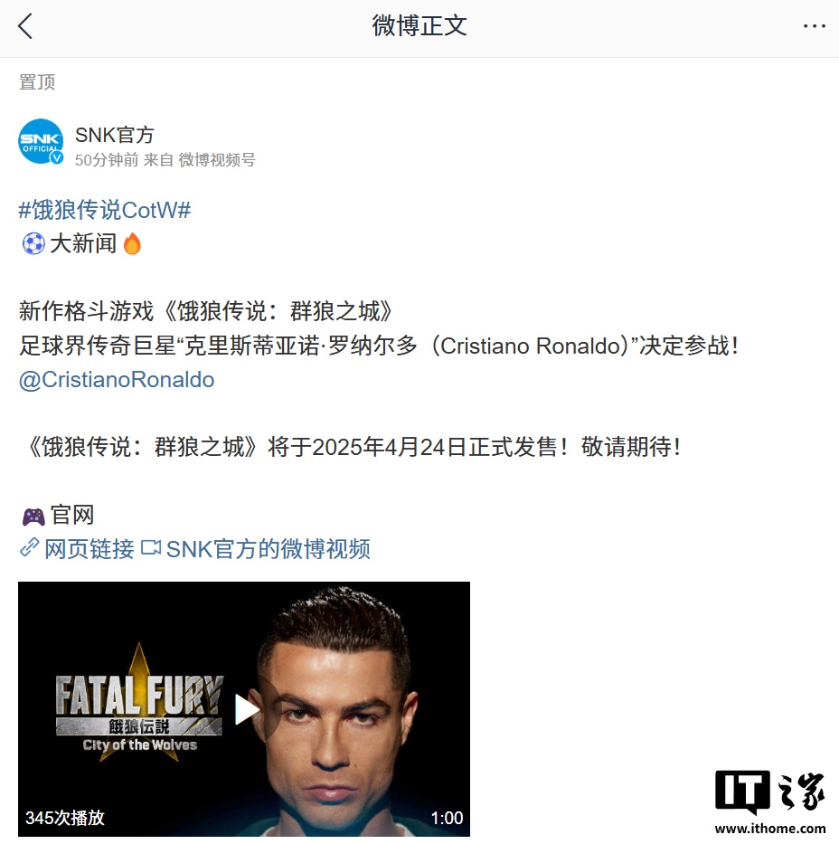 IT之家 3 月 27 日消息,SNK 官方今日宣布,葡萄牙足球运动员“克里斯蒂亚诺・罗纳尔多(Cristiano Ronaldo)”将作为游戏角色加入旗下格斗新作《饿狼传说:群狼之城》。