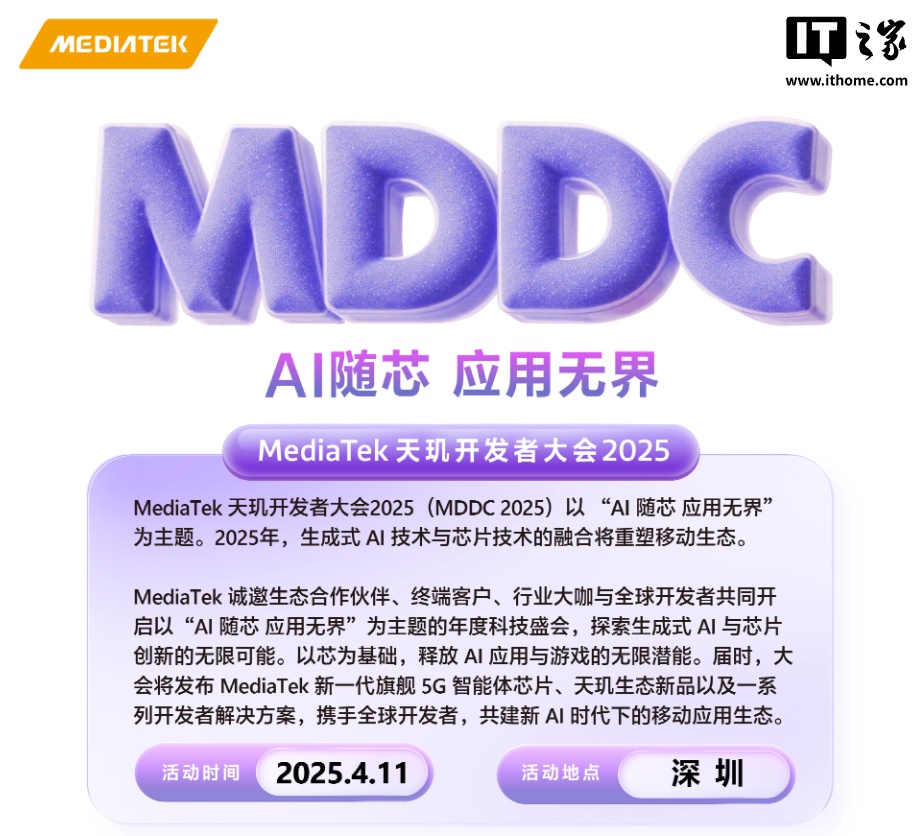 据IT之家此前报道,联发科本月(3 月 13 日)官宣,天玑开发者大会 2025 (MDDC 2025)将发布联发科新一代旗舰 5G 智能体芯片、天玑生态新品以及一系列开发者解决方案。