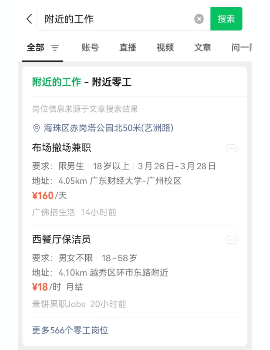 IT之家 3 月 27 日消息,据“微信派”公众号消息,现在,在微信内搜索“附近的工作”“兼职”“日结”“零工”等关键词,就能自动匹配所在城市的零工,还能根据“距离”“薪资待遇”“性别”等快速筛选。