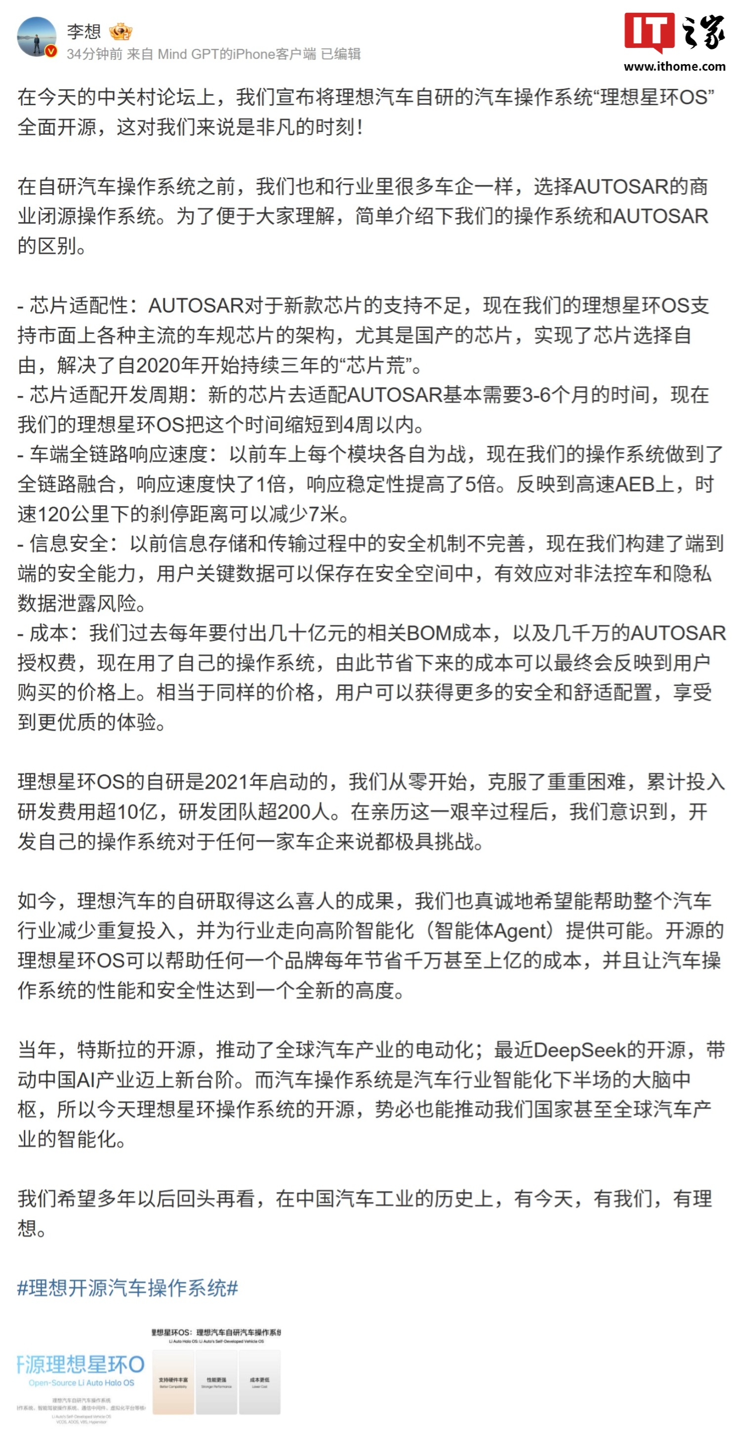 IT之家 3 月 27 日消息,在今日开幕的 2025 中关村论坛年会上,理想汽车创始人、董事长兼首席执行官李想发表演讲,并宣布开源自研汽车操作系统理想星环 OS。