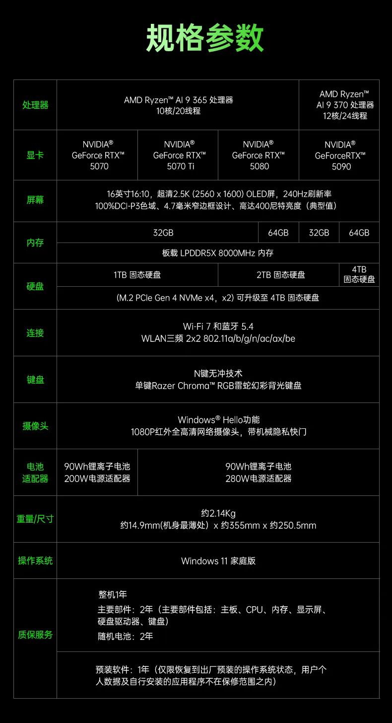 雷蛇灵刃 16 2025 游戏本配备 LPDDR5x-8000 内存、16 英寸 2.5K 240Hz 的 OLED 屏、90Wh 电池,可选 280W 适配器,重约 2.14kg,最薄处 14.9mm,提供双 USB4、双 USB-A、HDMI、SD 读卡器及 3.5mm 耳机孔。