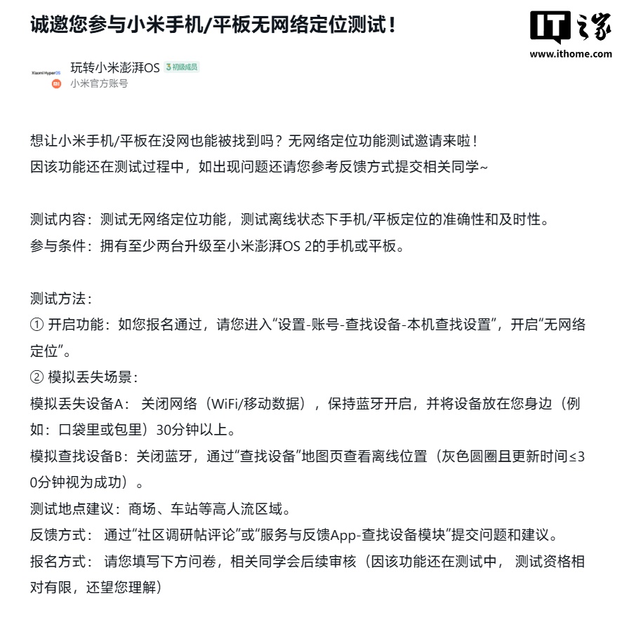 IT之家 3 月 27 日消息,小米社区昨晚开启了小米手机 / 平板无网络定位测试,主要测试离线状态下手机 / 平板定位的准确性和及时性,参与条件为拥有至少两台升级至小米澎湃 OS 2 的手机或平板。