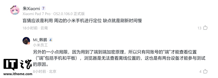 有网友猜测该测试是利用周边的小米手机进行定位,但缺点是刷新时间慢。认证为“小米员工”的“Mi_韩鹏”补充说,另外的一小点局限,因为用到了端到端加密原理,所以只有同账号的“端”才能查看位置(“端”包括手机和平板),浏览器是无法查看离线位置的,这也是有两台设备才能参与测试的原因。