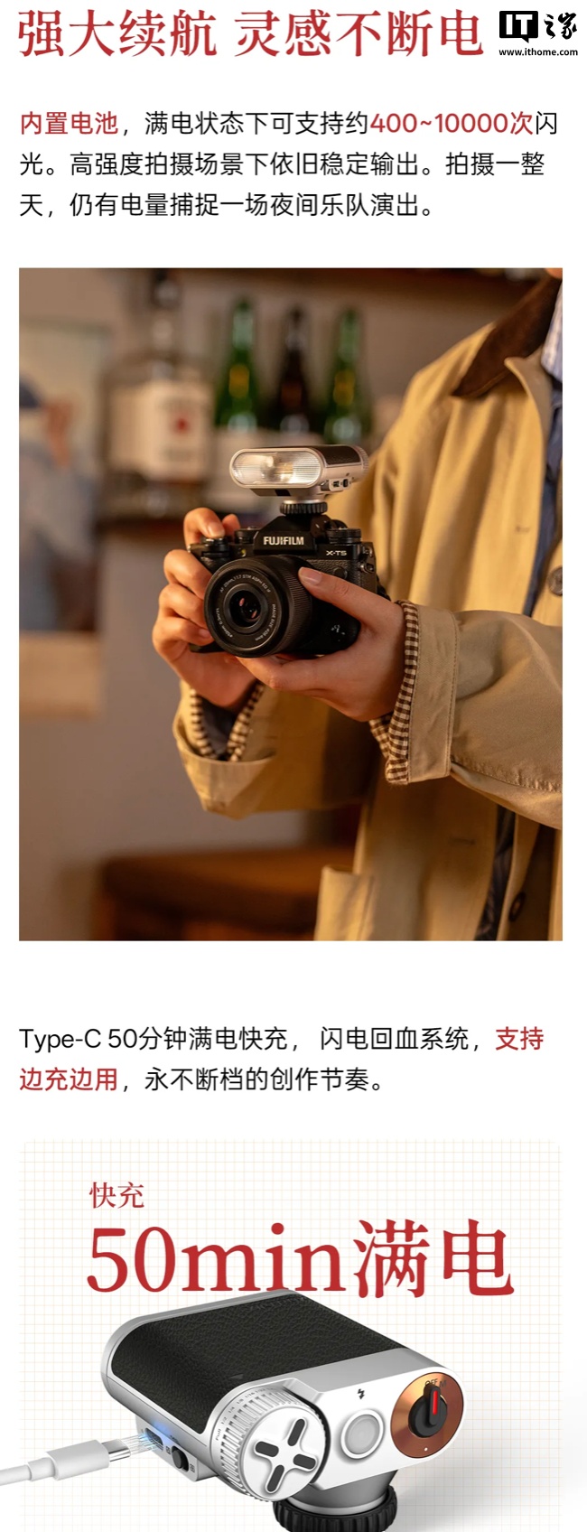 在参数方面,该闪光灯闪光指数 GN12,内置 7 档亮度模式,从 1/64-1/1,回电速度 0.2 秒-3.5 秒,闪光持续时间(T 0.5)1/5000 秒-1/50000 秒;内置两种光引闪模式,S1 模式可实现无线离机触发闪光灯,S2 模式可实现防预闪模式,在多灯协作时可规避频闪干扰;采用内置电池设计,满电状态下可支持约 400-10000 次闪光,充电口为 USB-C,可实现 50 分钟充满电,支持边充边用。