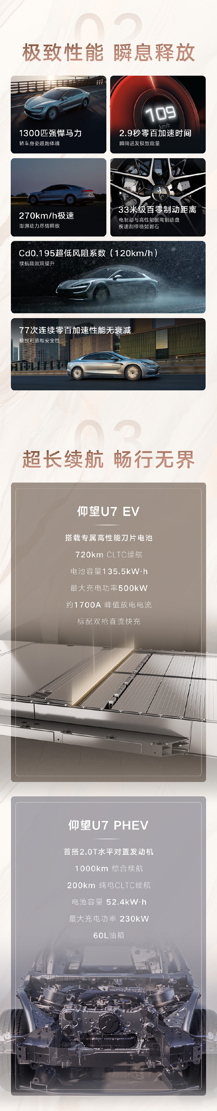 仰望 U7 插混版车型具备 52.4kWh 电池容量,最大充电功率可达 210kW,综合续航里程 1000km。纯电版车型电池容量达到 135.5kWh,CLTC 纯电续航 720 公里,从 30% 充电至 80% 仅需约 20 分钟,双枪最大直流充电功率 500kW。