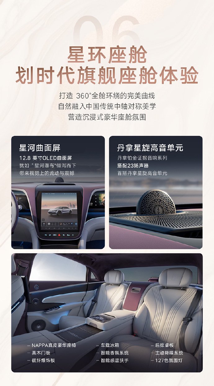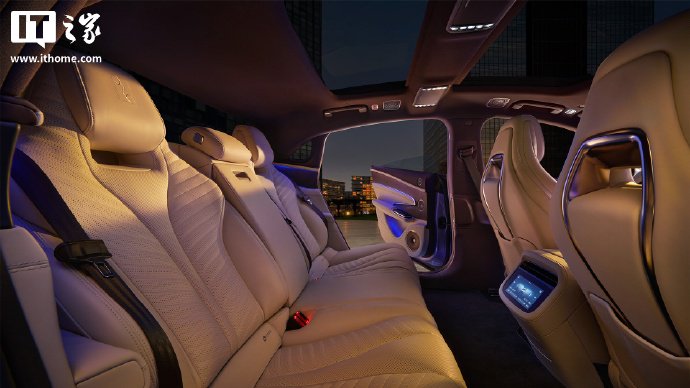 全系标配 Nappa 真皮座椅,支持通风、加热与按摩功能,四座版更配备后排双悬浮屏与双冰箱,车载丹拿铂金证据系列音响。