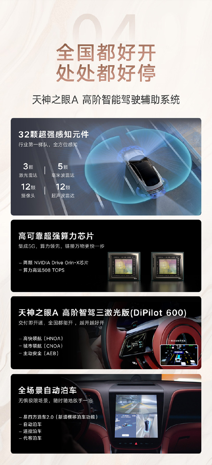 在自动驾驶辅助方面,仰望 U7 搭载天神之眼 A-高阶智驾三激光版(DiPilot 600)智驾系统,支持全场景高阶辅助驾驶。其「代客泊车」功能可记忆 1000 米路径,20 厘米极限窄车位的成功率高达 98%。