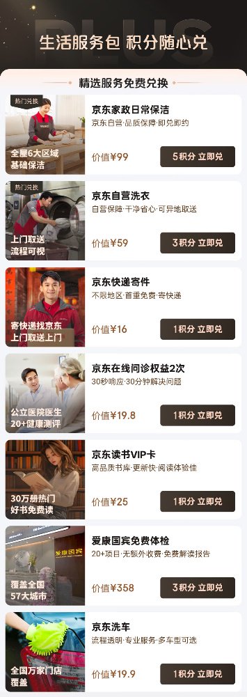 比如,京东 PLUS 会员用 3 积分可以免费兑换一次价值 358 元的体检服务,5 积分可以免费兑换一次价值 99 元的家政保洁服务(快递 1 积分)。