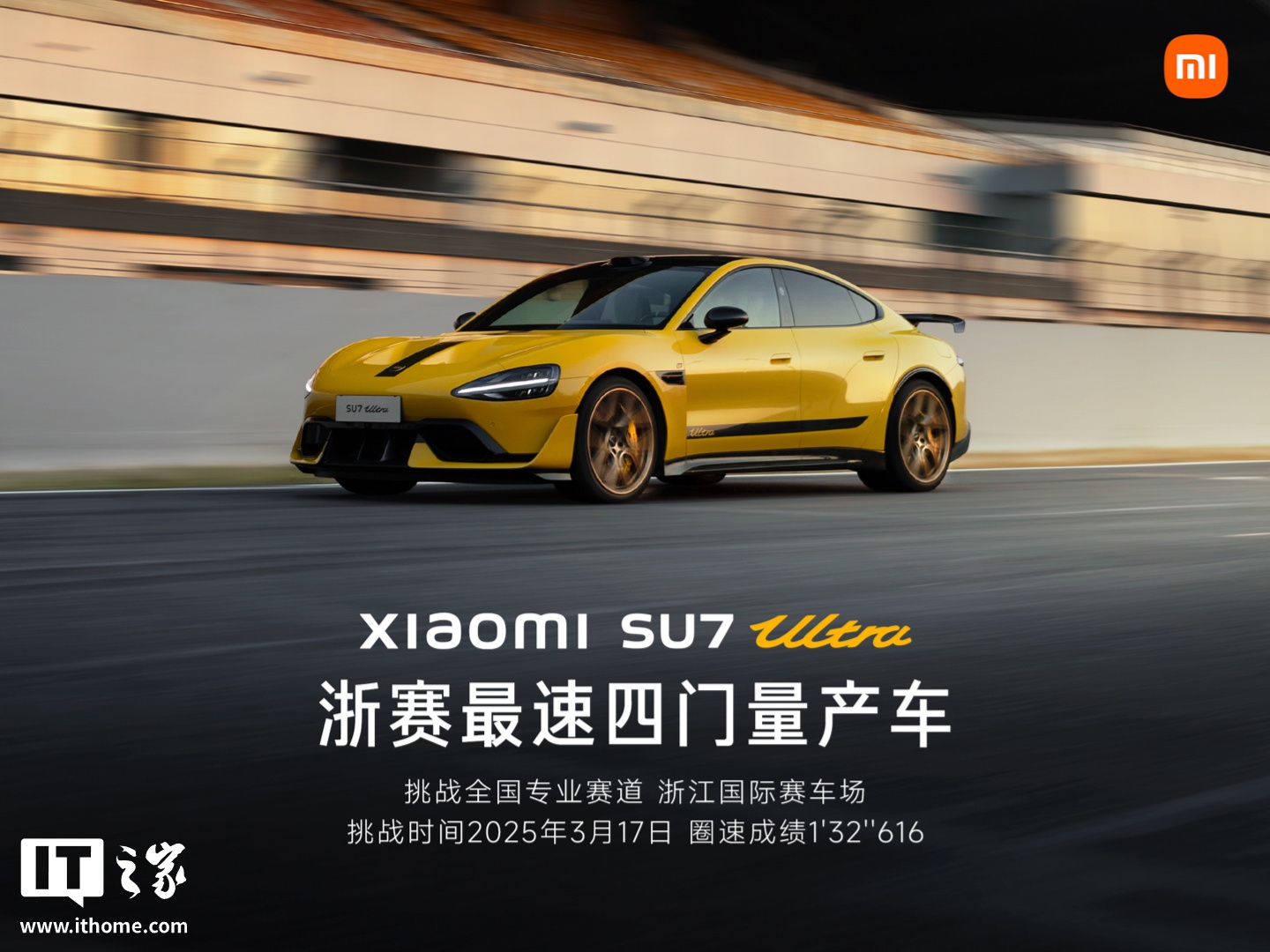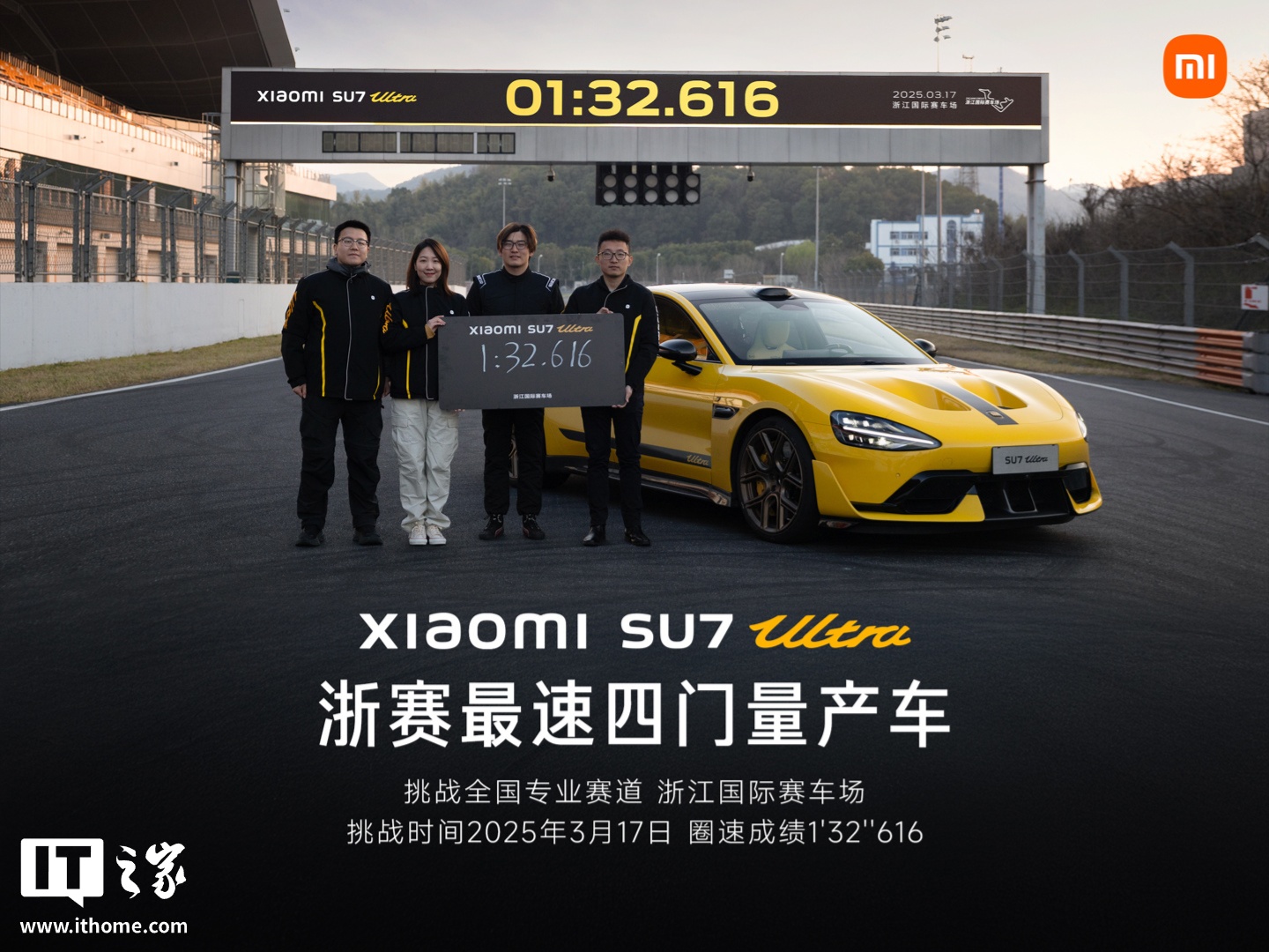 IT之家 3 月 28 日消息,小米汽车宣布,小米 SU7 Ultra 刷新浙江国际赛车场四门车圈速纪录,成浙赛最速四门量产车,圈速成绩为 1 分 32 秒 616。
