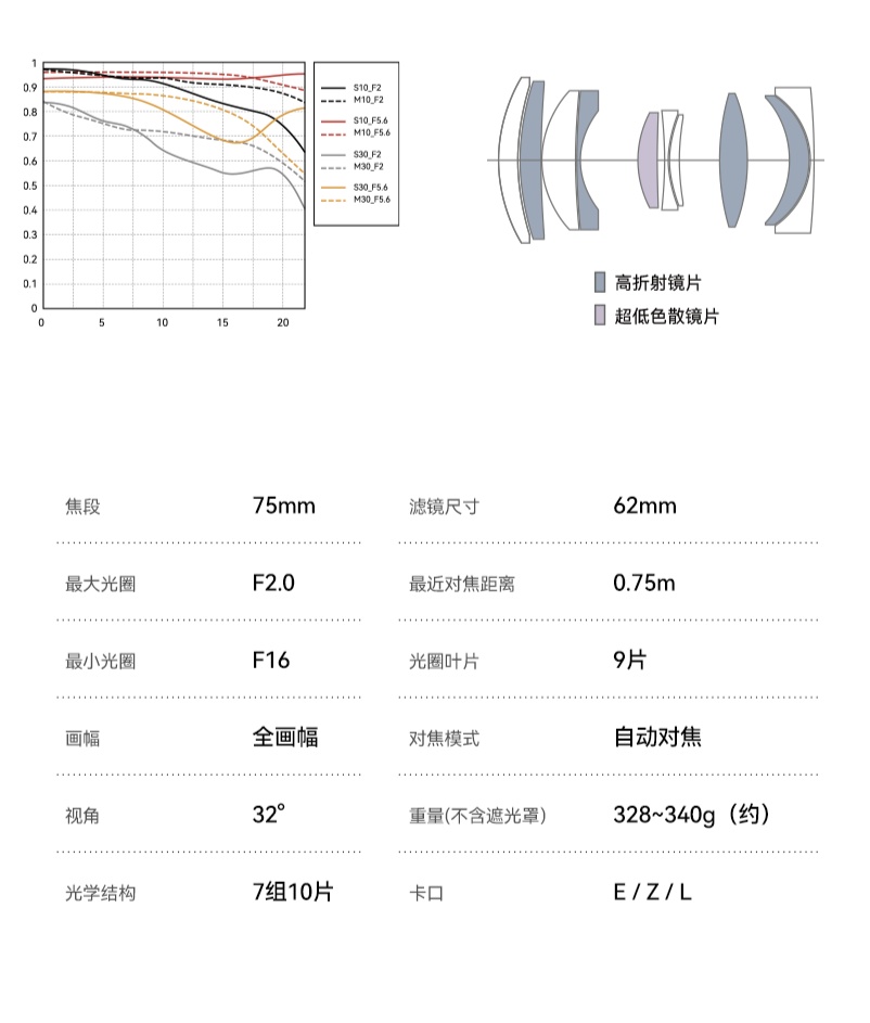 这款镜头采用 7 组 10 片光学结构、9 片光圈叶片,最近对焦距离为 0.75 米,配备 62mm 的圆形滤镜,重约 328~340 克,可通过 Type-C 进行固件升级。IT之家附规格详情如下: