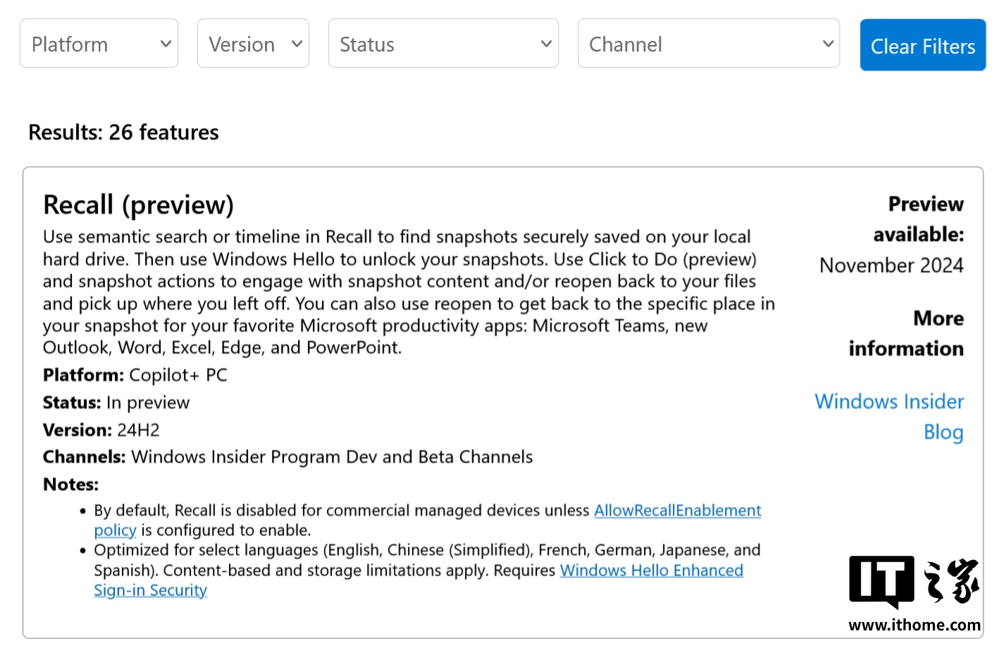 微软表示该网站的目标是让用户明晰了解“已全面推送”、“Insider 专属”、“分阶段推送”三类 Windows 11 内容,并在功能上明确标注适用于 Windows 11 AI+ PC 和普通 PC 的功能,便于用户区分。IT之家附上相关截图如下: