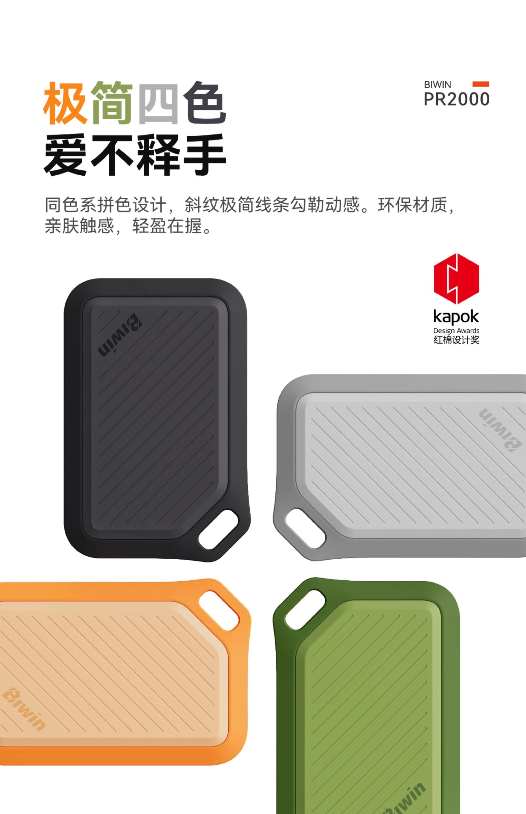 佰维为 PR2000 三防移动固态硬盘提供了极夜黑、冰川灰、跃动橙、夏日绿四种同色系拼色外观,随附登山扣和 USB-C to C+A 二合一数据线,各版本售价可参看IT之家整理: