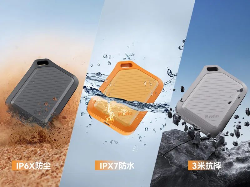 PR2000 三防移动固态硬盘外部采用硅胶 + TPU 材质,结合大圆角设计具有良好缓冲效果,可承受从 3m 高度位置跌落产生的冲击;此外其支持 IP67 防尘防水,能应对 1m 水深 30 分钟短暂浸泡的挑战。
