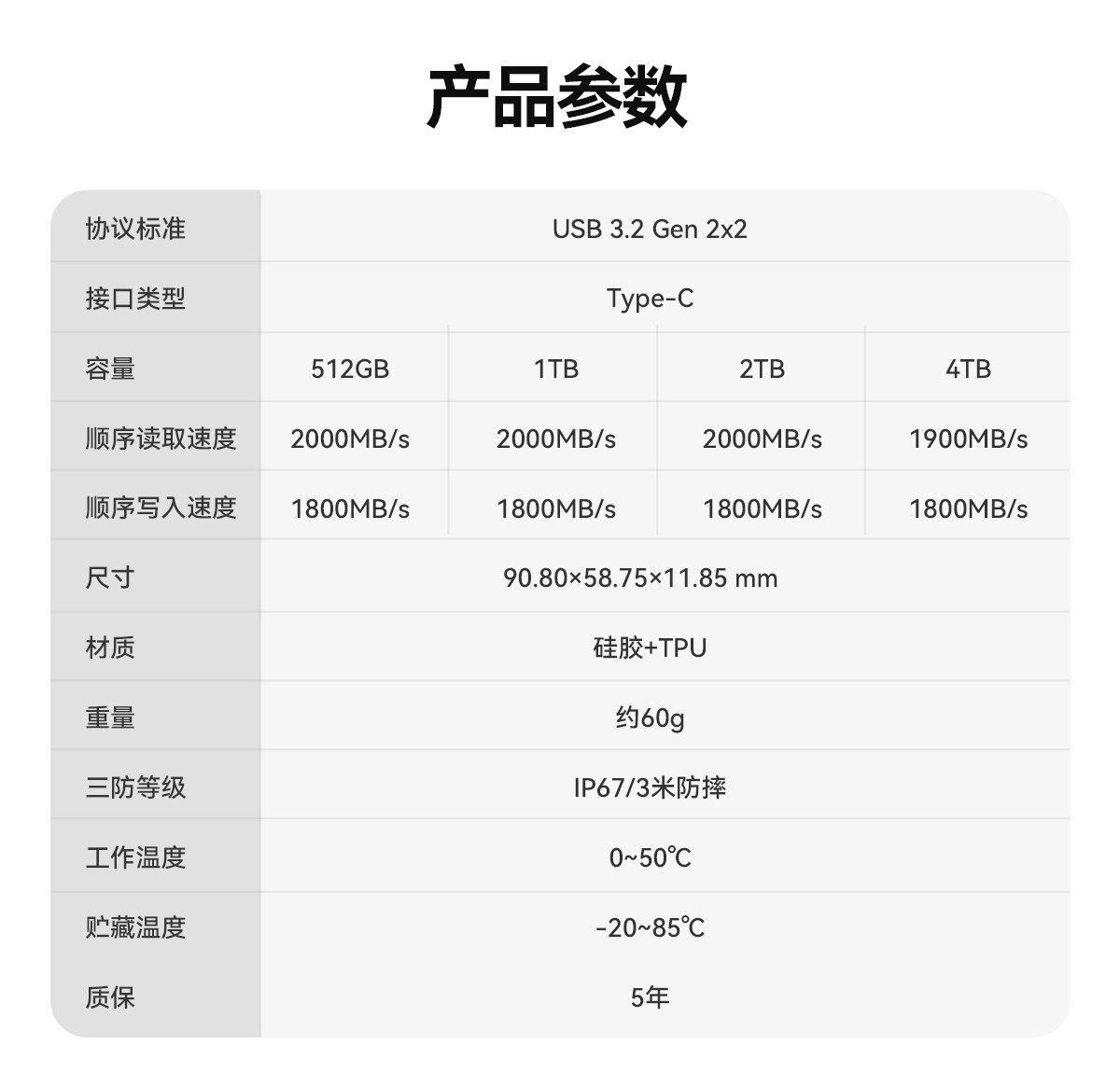 而在性能方面,PR2000 采用 USB 3.2 Gen 2×2 (20Gbps) 主控,基于“优选”3D TLC NAND 闪存,容量覆盖 512GB~4TB,享受 5 年质保。其具体参数见下: