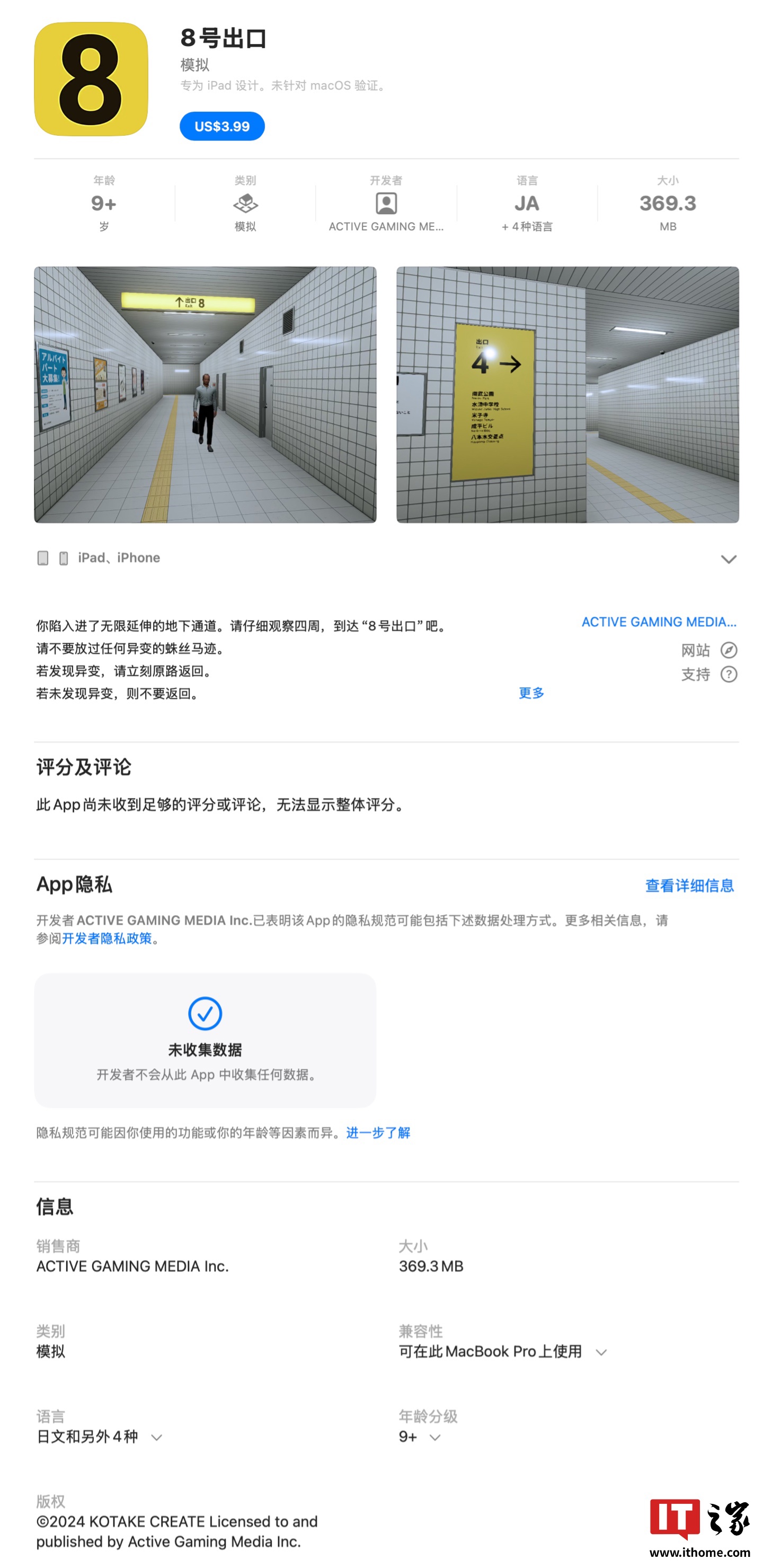 IT之家 3 月 28 日消息,《8 号出口(8番出口)》是 KOTAKE CREATE 开发的解密恐怖游戏,于 2023 年 11 月 29 日在 Steam 上发售,玩家在游戏中需要设法逃离一个无限延续的地铁站地下通道。