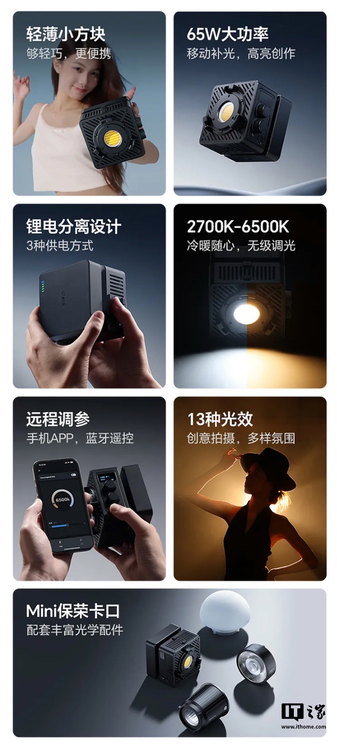 IT之家 3 月 28 日消息,Ulanzi 优篮子在 3 月 24 日发布“小方灯”65W 摄影灯,目前相应产品已在京东开启首销,该摄影灯主打“锂电分离设计、2700K-6500K 无极调光、13 种光效”,IT之家整理具体定价如下: