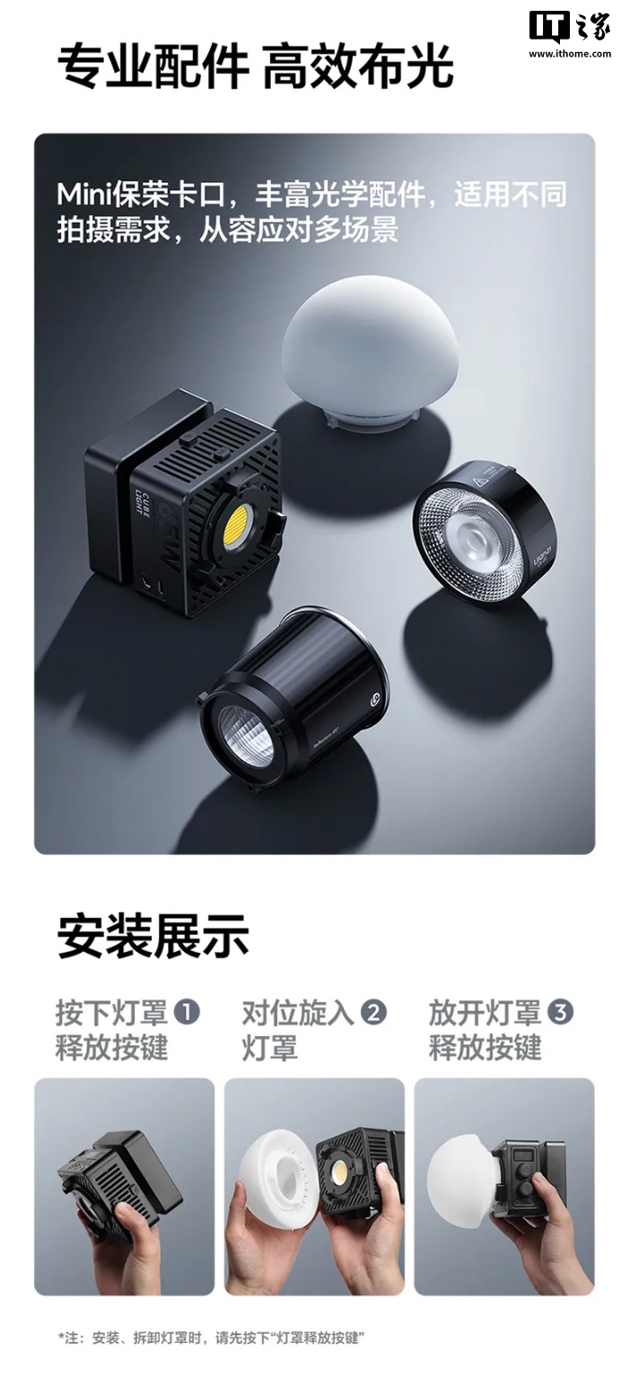 官方同时强调了这款摄影灯配备的“Mini 保荣卡口”,可连接聚光透镜、标准遮光罩、硅胶柔光罩等产品,便于不同摄影场合使用。