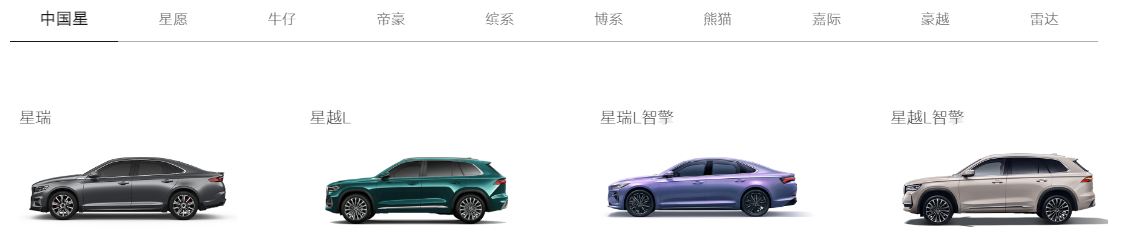 IT之家查询吉利汽车官网获悉,吉利中国星目前拥有星瑞、星越 L、星瑞 L 智擎、星越 L 智擎 4 款车型。