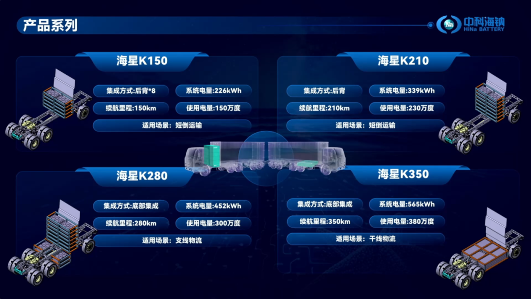 针对不同场景的差异化需求,【中科海钠・海星】钠离子电池商用车解决方案提供“海星 K150”、“海星 K210”、“海星 K280”和“海星 K350”四款产品型号,前两款产品专为短倒运输场景设计,后两款产品则定位于物流运输领域的技术需求。