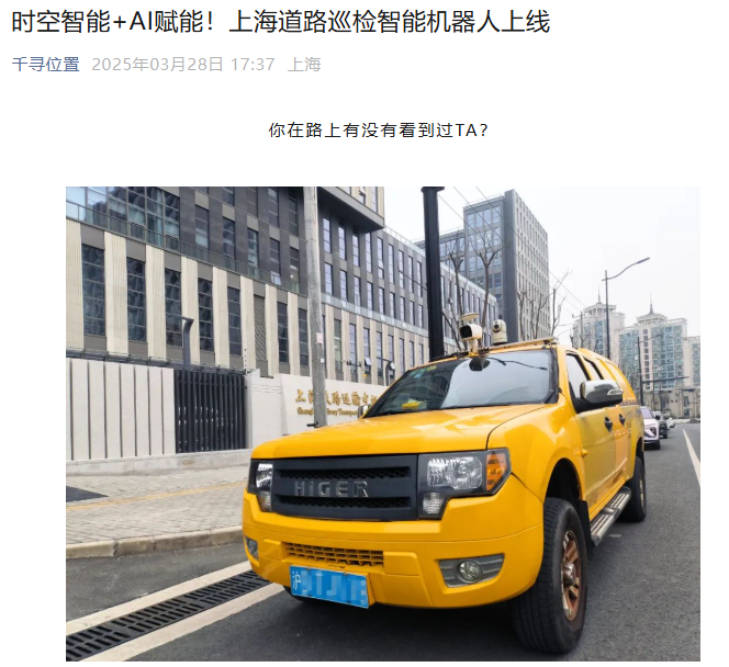 千寻位置表示,上海道路智能巡检机器人每天在上海市区行进约 50 公里,对车辆所及之处道路坑槽、裂缝等病害,以及隔离带损坏等异常情况进行巡查。
