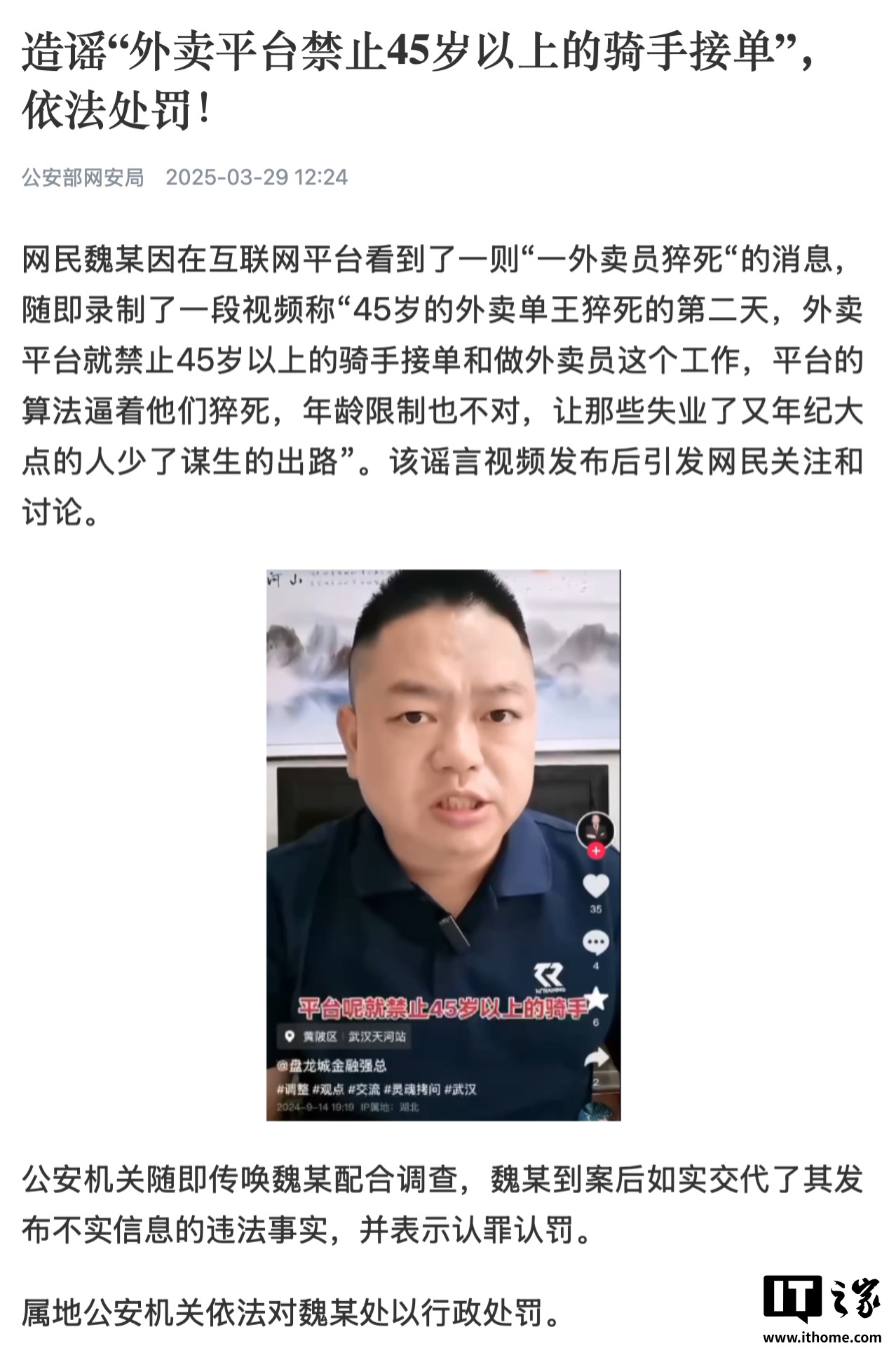 IT之家参考通报获悉,网民魏某因在互联网平台看到了一则“一外卖员猝死”的消息,随即录制了一段视频称“45 岁的外卖单王猝死的第二天,外卖平台就禁止 45 岁以上的骑手接单和做外卖员这个工作,平台的算法逼着他们猝死,年龄限制也不对,让那些失业了又年纪大点的人少了谋生的出路”。