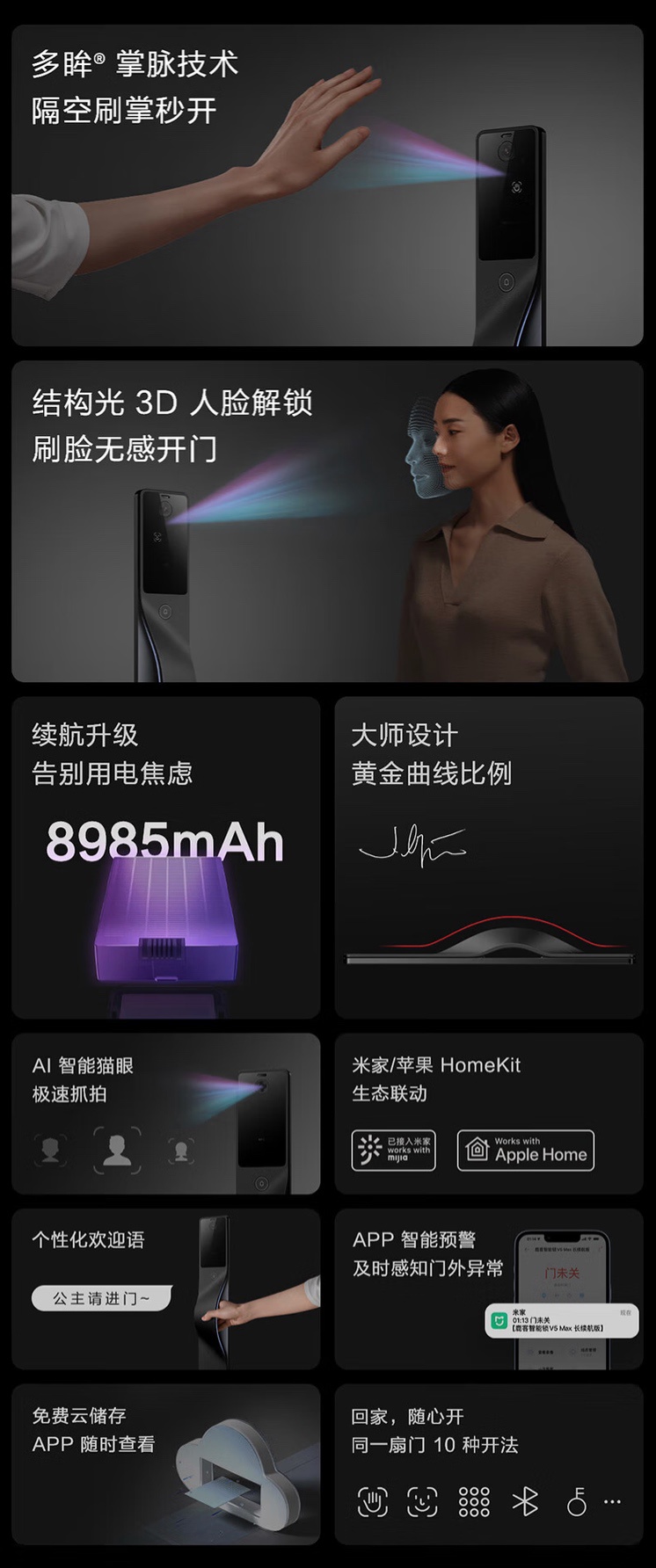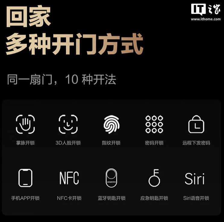 该门锁应用了多眸掌静脉识别技术,同时配备结构光 3D 解锁,其他方面还支持指纹开锁、密码开锁、手机 App 开锁、NFC 卡开锁、蓝牙钥匙开锁、Siri 语音开锁、应急钥匙开锁。