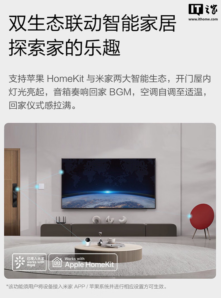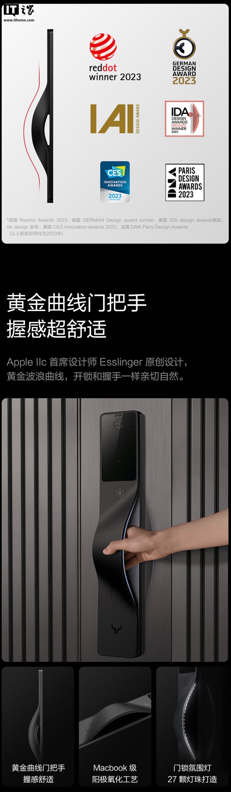 该门锁可选黑灰双色,表面使用阳极氧化工艺,配备 27 颗灯珠氛围灯,拥有“黄金波浪曲线”设计。