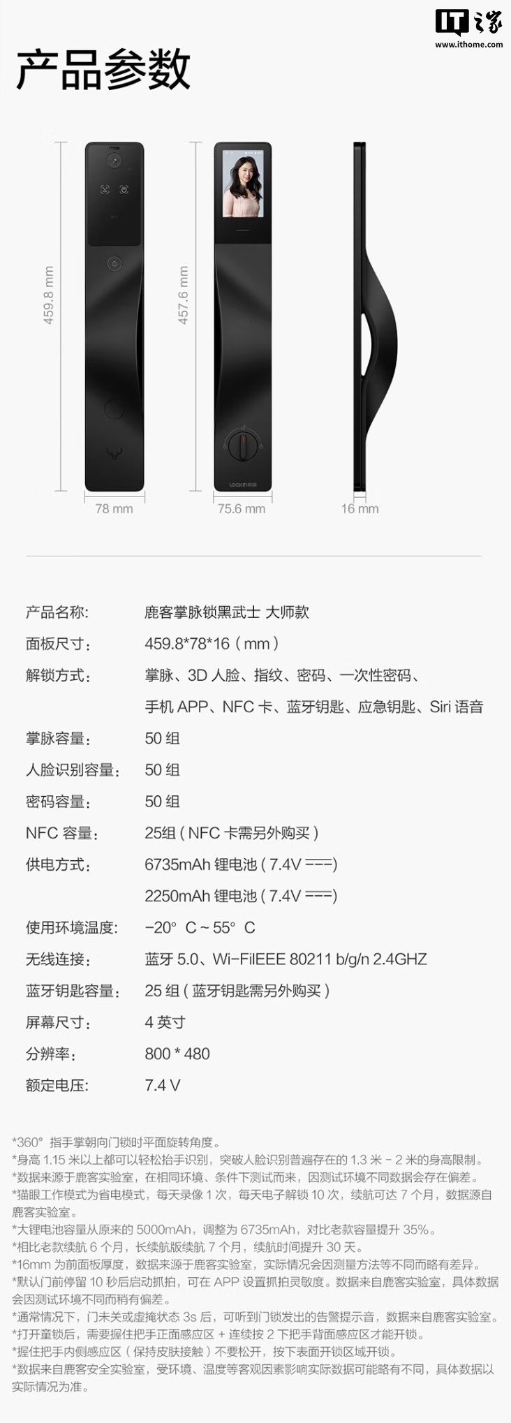 该门锁配备双 2K 分辨率摄像头,配备 4 英寸内屏,门锁内置 8985 毫安时电池(6735 毫安时 + 2250 毫安时)。