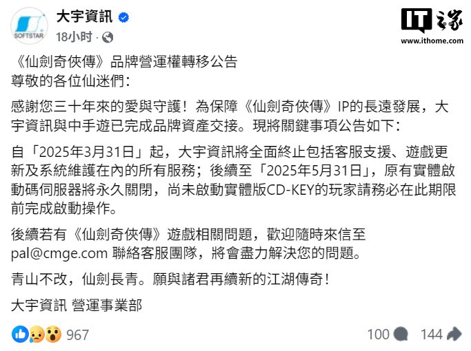 IT之家 3 月 30 日消息,大宇资讯昨日发布《仙剑奇侠传》品牌营运权转移公告: