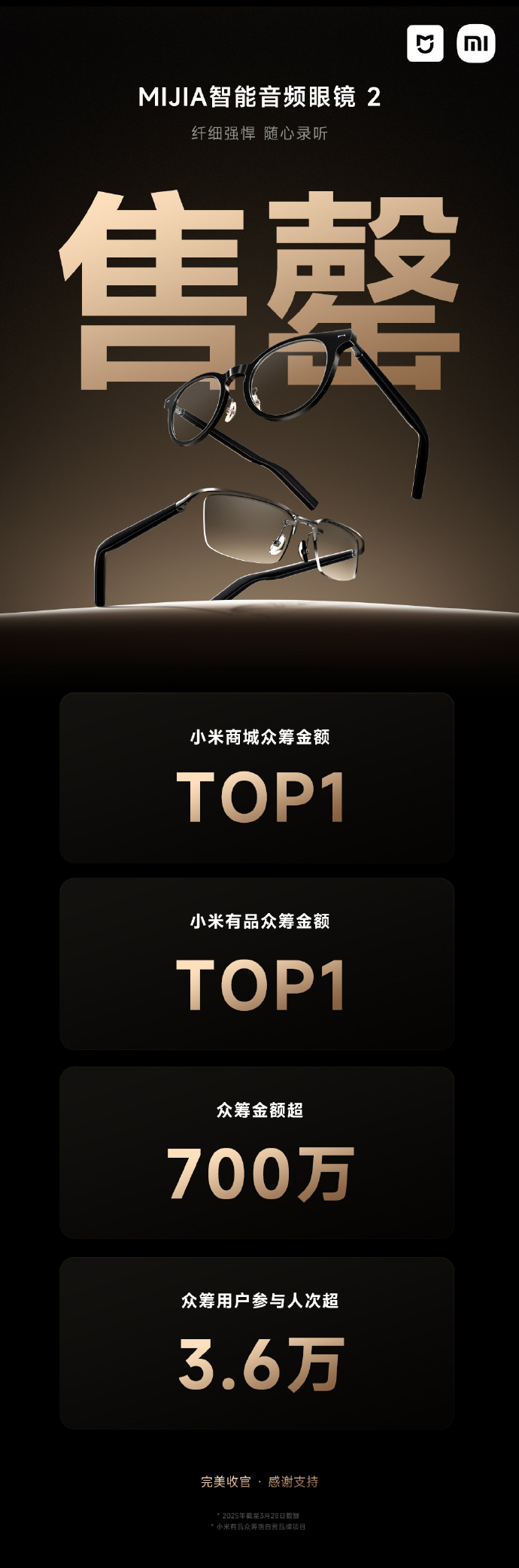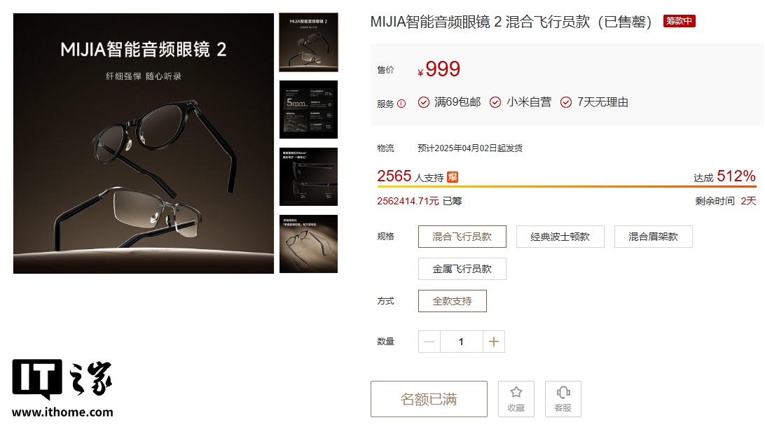 IT之家 3 月 31 日消息,小米 MIJIA 智能音频眼镜 2 于 3 月 26 日开启众筹,小米有品众筹价 999 元,小米有品显示四种款式均名额已满。