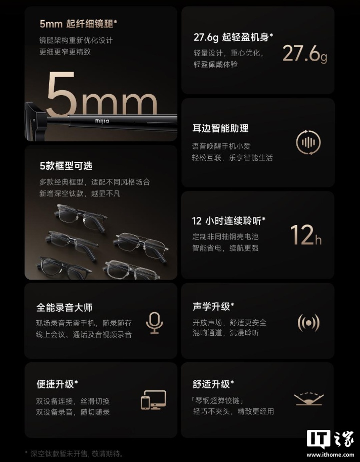 据介绍,小米 MIJIA 智能音频眼镜 2 采用轻量化设计,提供语音唤醒手机小爱、双设备连接、通知播报、双设备录音等功能,IT之家附产品亮点、参数信息如下: