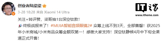 蜂巢科技合伙人 @创业者陆柒柒 透露,该产品众筹上线不到 3 天全部售罄,获 2025 年小米商城 / 小米有品众筹金额双第一,深空钛静候 4 月中下旬全渠道正式开售。