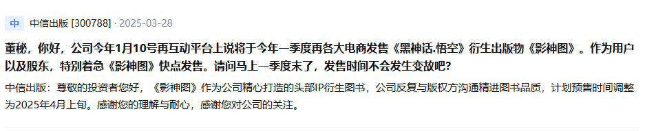 IT之家 3 月 31 日消息,近日,有投资者询问中信出版关于《黑神话:悟空》影神图实体版的发售事宜,中信出版回应称:“公司反复与版权方沟通精进图书品质,计划预售时间调整为 2025 年 4 月上旬。”