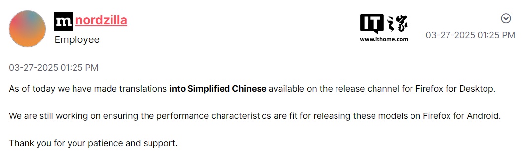 经IT之家小伙伴测试,Firefox 136、135 已支持将简体中文作为目标语言。此前,Firefox 135 开始在本地翻译中添加简体中文支持,但仅支持作为源语言。