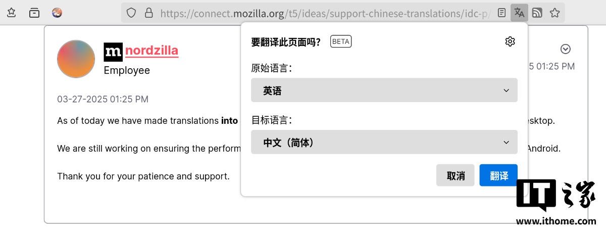 IT之家 3 月 31 日消息,火狐浏览器 Firefox 官方人员 3 月 27 日宣布,火狐浏览器桌面端的本地翻译已完全支持简体中文,可以作为源语言及目标语言进行翻译。