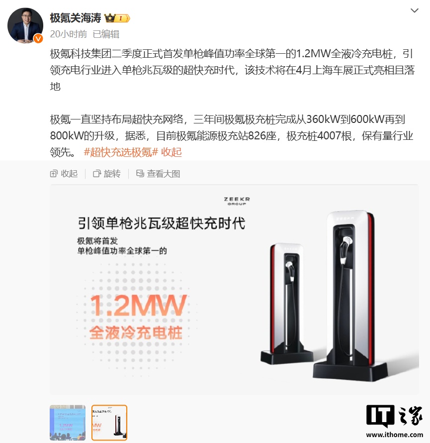 极氪科技集团 CBO 关海涛发文称:“极氪科技集团二季度正式首发单枪峰值功率全球第一的 1.2MW 全液冷充电桩,引领充电行业进入单枪兆瓦级的超快充时代,该技术将在 4 月上海车展正式亮相且落地。”