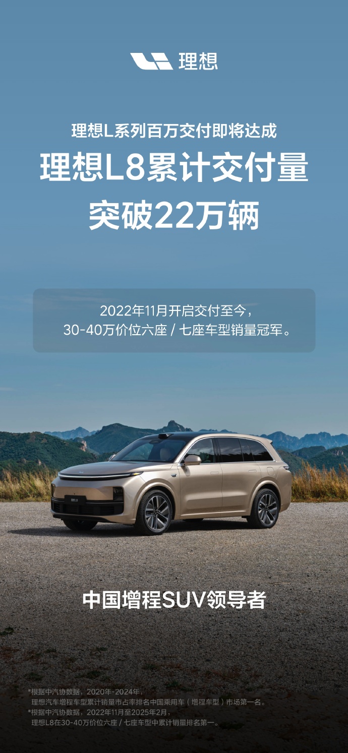 理想 L8 累计交付量突破 22 万辆:2022 年 11 月开启交付至今,30-40 万价位六座 / 七座车型销量冠军。