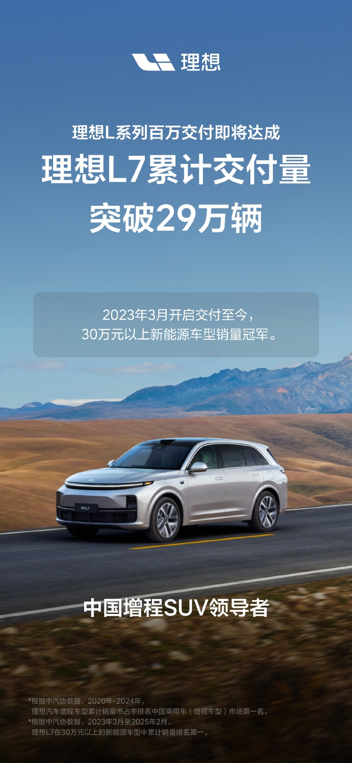 理想 L7 累计交付量突破 29 万辆:2023 年 3 月开启交付至今,30 万元以上新能源车型销量冠军。